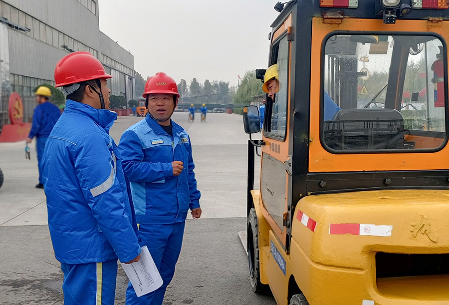 氯化钙装置现场,维保人员李洪臣刚完成了钙泥洗涤池顶部的刷漆任务,从爬梯下来安全到达地面,就得到了车间主任张瑞东、环保科长陈建振的表扬。随后,双方现场就如何安全进行高处作业进行沟通交流,李洪臣还详细讲述了安全带的佩戴和使用要求,由此获得了20分激励卡。