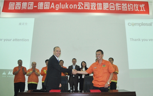 签约仪式上,来访客人首先介绍了德国Aglukon公司概况、叶面肥、悬浊液肥料的特点以及在作物栽培方面的应用效果。双方还就液体水溶肥在国内合作生产、销售等方面问题交换了意见。随后,德国Aglukon公司的市场营销兼研发部总经理Benjamin Klug先生和鲁西化肥工业集团副总经理李书海在协议书上签字。