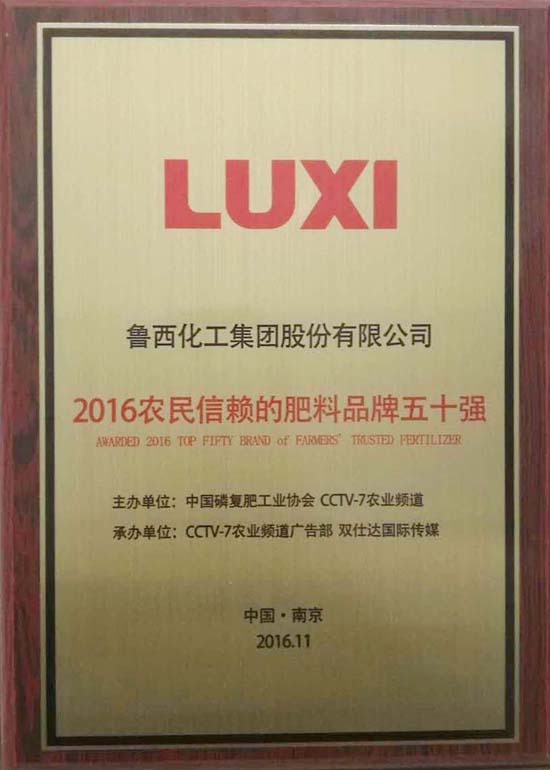 以其过硬的产品质量、良好的市场知名度、较强的品牌影响力,荣获“2016农民信赖的肥料品牌五十强”荣誉称号