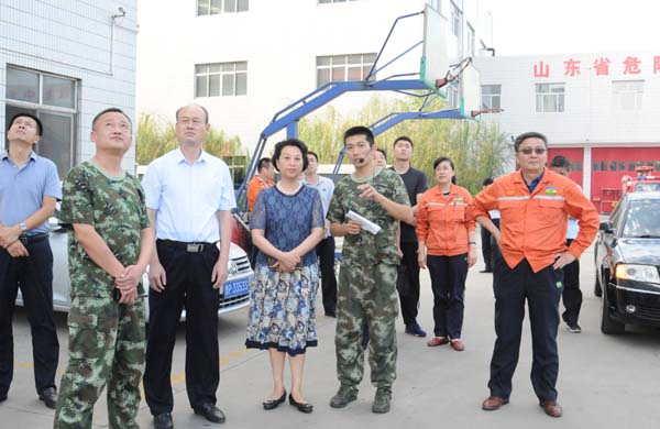 领导一行先后参观了园区生产装置、项目建设现场、应急救援中心、实训基地、运行指挥中心和产品展厅。在应急救援中心,于娜政委实地了解了救援中心的营房建设、设施器材配备、应急救援指挥平台建设等情况,并现场观摩了队员们的体能训练、技术竞赛科目演练,以及56米高空救援车和涡喷救援车的出水操作模拟演练情况。在运行指挥中心,领导们通过智慧化工园区平台详细了解了集团在安全、环保、消防应急、节能和电商物流等方面的智能信息化管控情况。