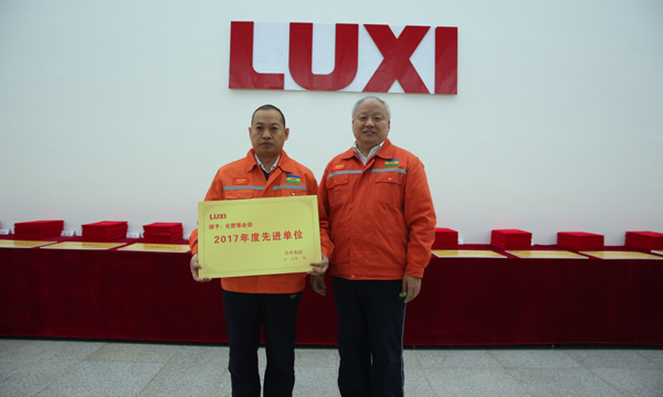 图为董事长为先进单位化肥事业部颁奖。