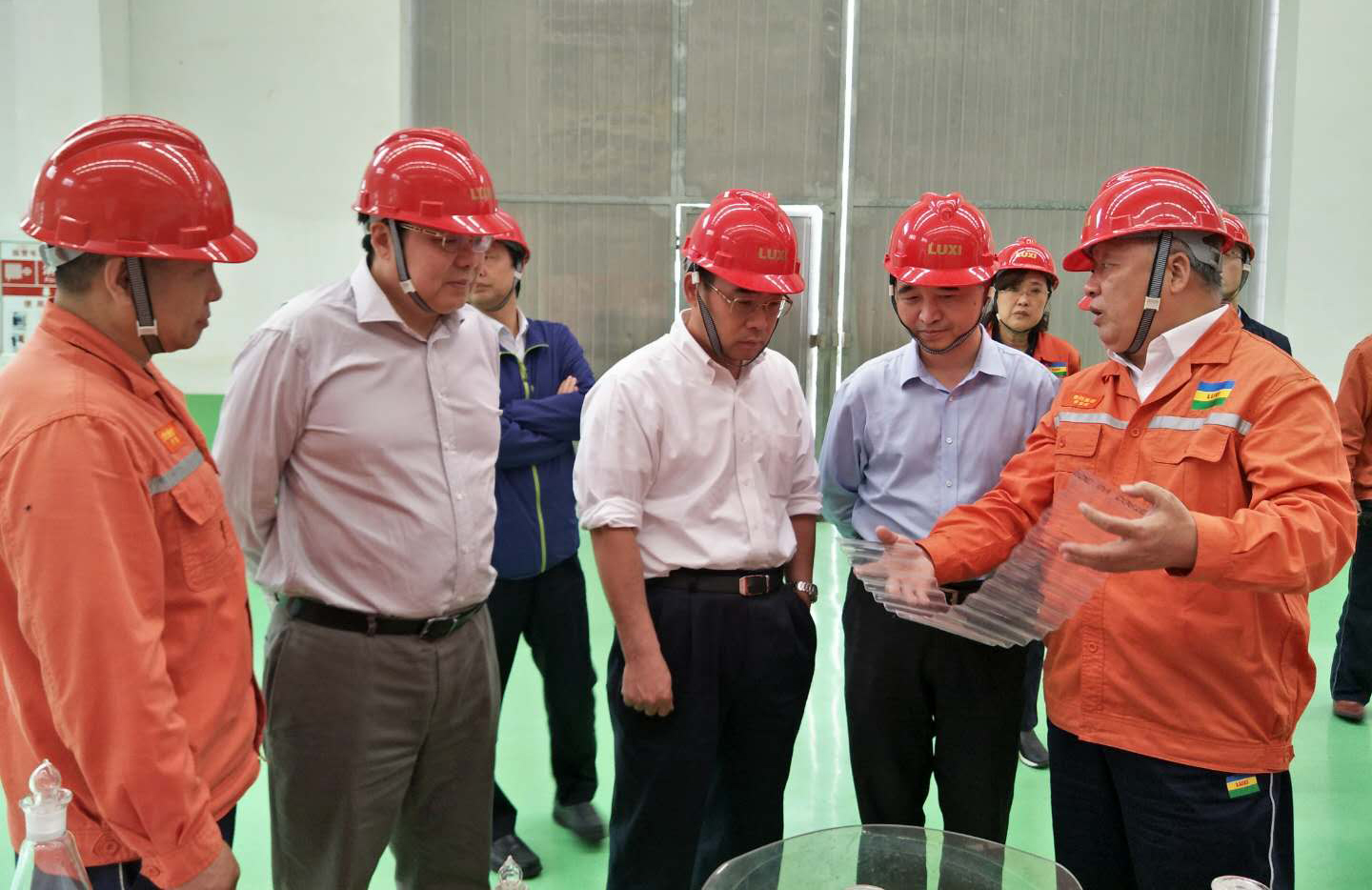 化工新材料产业园期间,深入氟材料生产车间、重型装备厂房、聚碳酸酯包装厂房和退城进园装置总控室,重点了解了园区产业链的布局和延伸情况,新材料产品的研发、生产以及上下游的关联情况,化工装备的研发设计制造安装水平等。通过参观技术中心大楼的科研实训基地、运行指挥中心和产品展厅,重点了解了集团员工培训培养、全力建设中国智慧化工园区以及企业实现转型升级和新旧动能转换的典型做法。