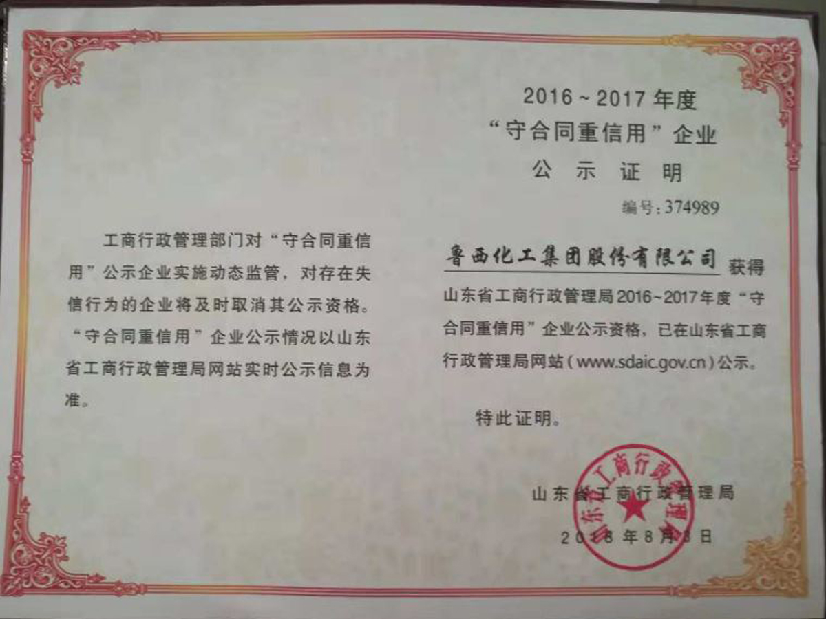 收到了山东省工商行政管理局颁发的“2016-2017年度守合同重信用”的表彰证书。