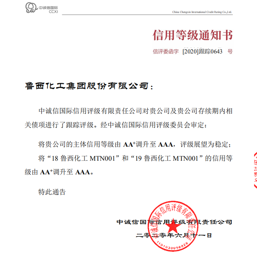 中诚信国际信用评级有限公司是国家发改委和中国人民银行认可的市场领先的信用评级机构。本次信用等级调整主要是基于,中国中化集团有限公司成为公司实际控制人后,公司将获得更强的外部支持,中化集团将通过扩大投资、技术支持、管理提升和产业协同等方式帮助公司建设一流的化工新材料产业园。此外,鲁西化工继续保持了突出的产业链与园区一体化优势,并持续向化工新材料方向转型,较为通畅的融资渠道亦对公司整体信用实力提供了有力支持。