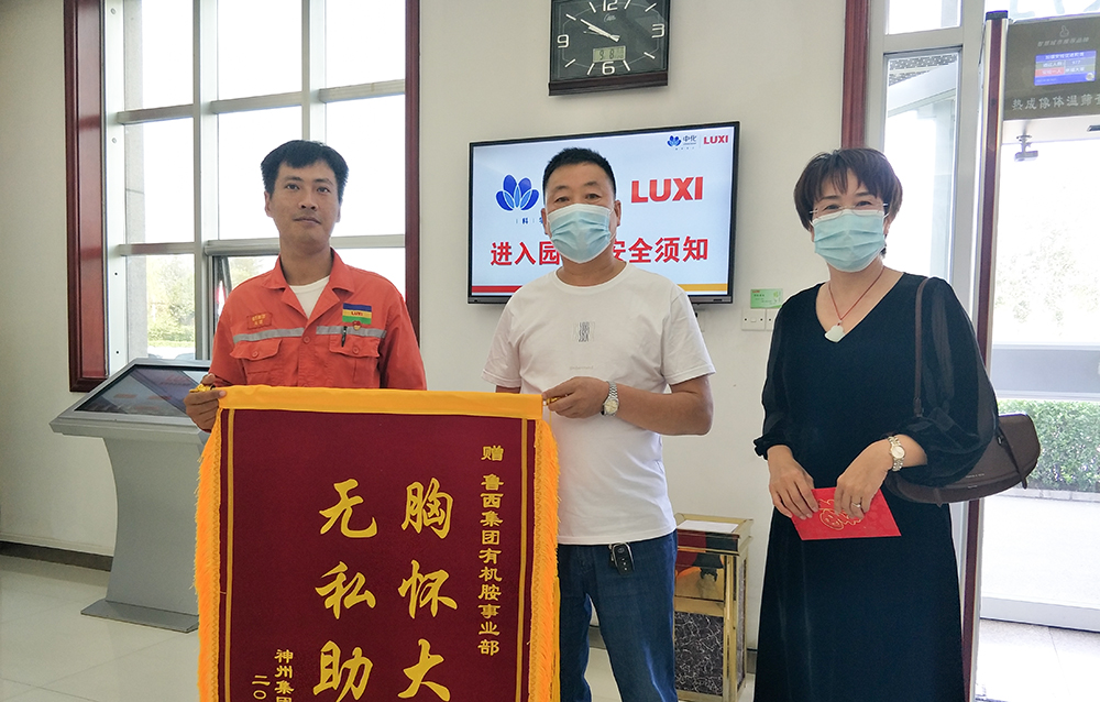 来当面答谢这救命大恩,可是因为近期疫情的原因,一直没有来。现在疫情缓解,我们也终于将准备了多时的锦旗和感谢信送到你们手中,感谢有机胺事业部员工为救助病人付出的努力!同时拿出3000元慰问金和6箱水果对相关员工表示感谢,被冯波婉言谢绝:“这都是我们应该做的,不光是我们,任何一个鲁西员工遇到这种事,都会毫不犹豫的去做。这不但是我们企业一直倡导激励的行为,也多亏了企业平时对这种应急处理技能的日常培训。”