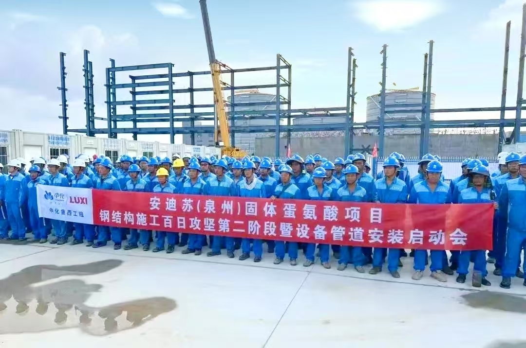 中化鲁西工程承建的安迪苏(泉州)蛋氨酸项目现场,隆重举行"钢结构安装第二阶段暨设备管道安装启动会"仪式。全体建设者将以时不我待的紧迫感、精益求精的专业态度和勇担重任的使命感,凝心聚力,攻坚克难,坚决打赢钢结构安装收官战,高效推进设备管道安装新战役,确保项目整体建设进度目标按期完成。