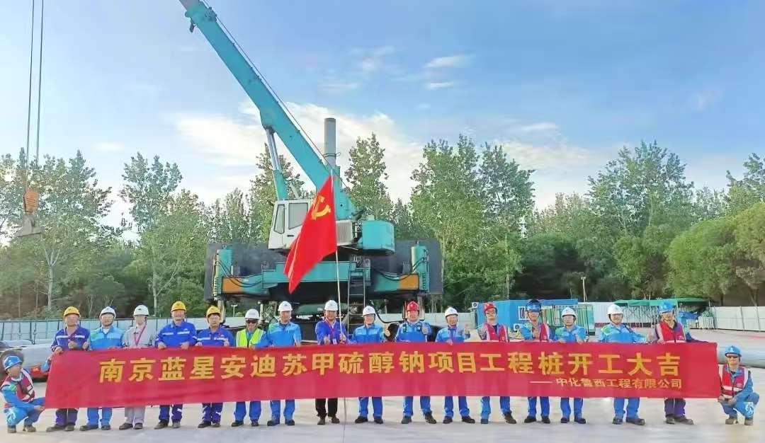 中化鲁西工程承建的南京蓝星安迪苏甲硫醇钠项目工程桩开工仪式隆重举行。项目从筹备到开工,施工团队始终秉持"安全第一、质量至上"的理念,行非常规之举,采取非常规措施,在最短时间内推进土建桩机开工。