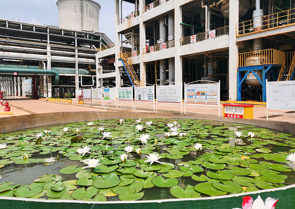 氯甲烷事业部,在高大的生产框架之边,首先映入眼帘的是一排排青翠欲滴的冬青、红绿相间的石榴树。还会发现三个2米方圆的大鱼缸,里面有跃动的喷泉、灵动的金鱼、青青的荷叶,还有洁白的荷花。员工在